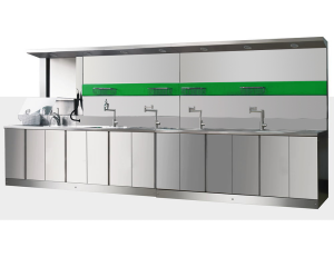 五槽式組合:預洗槽+蒸汽清洗槽+浸泡槽+(全自動或普通)超聲清洗(臺式或升降式)+漂洗槽+煮沸消毒上油(臺式或升降式)+熱風干燥或干燥臺干燥